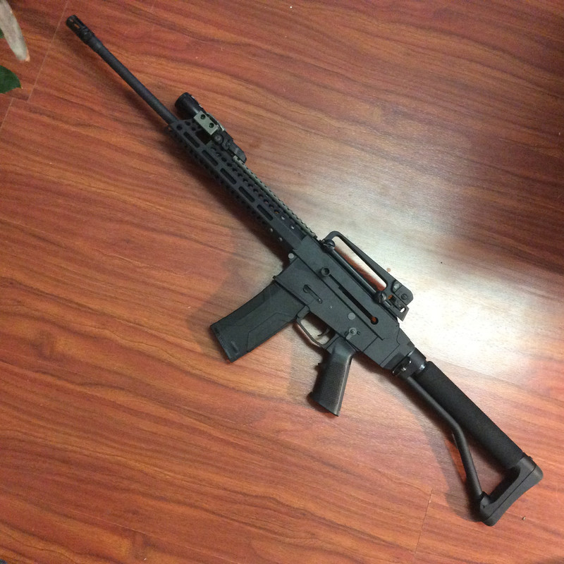 MOE stock ,IMI Defense shaved grip, magdump.ca 17" handguard till I can get another BCM.