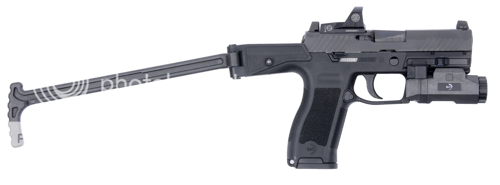 Enter the B&T USW systems for the Sig P320 and Glock G17/G19. Roughly based on the original Swiss-based B&T USW, or “Universal Service Weapon”: (a SA/DA hammer fired semi-automatic pistol with enhanced capabilities that offers law enforcement officials the light weight and compact size of a holsterable sidearm and the extended range, accuracy and stability of a small-sized sub-machine gun.)
