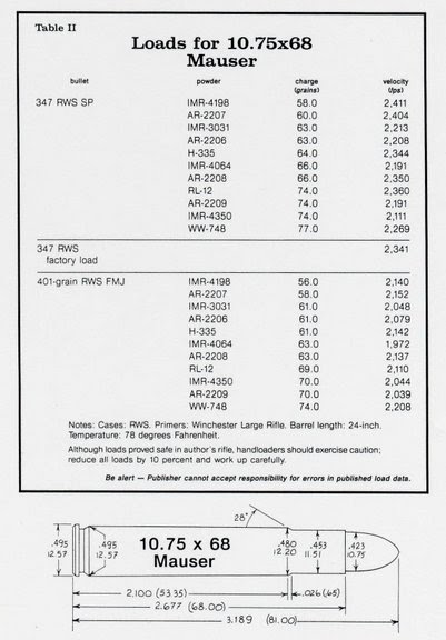 it's funny how this mauser has a poor reputation in africa for the big five. aside from the really big stuff you would think it would be good. i would also think, with handloaded 400 grain bullets it certainly should be very effective since it would be a 90 percent 400/450. i personally think it would be a cool cartridge historically, especially if one wanted a trio of mausers (7x57, 9.3x63 and the 10.75x68). Neat!