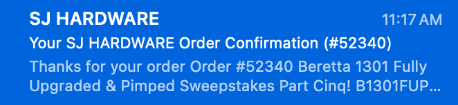 Yup…same one. I bought my ticket Saturday and told a buddy. He said it showed sold out by Saturday night!Nope, you’re probably thinking of a previous draw. This was “Beretta 1301 Part Cinq” unless I’m in the wrong thread. There was one ticket left in stock - order #52340