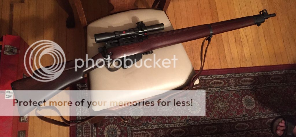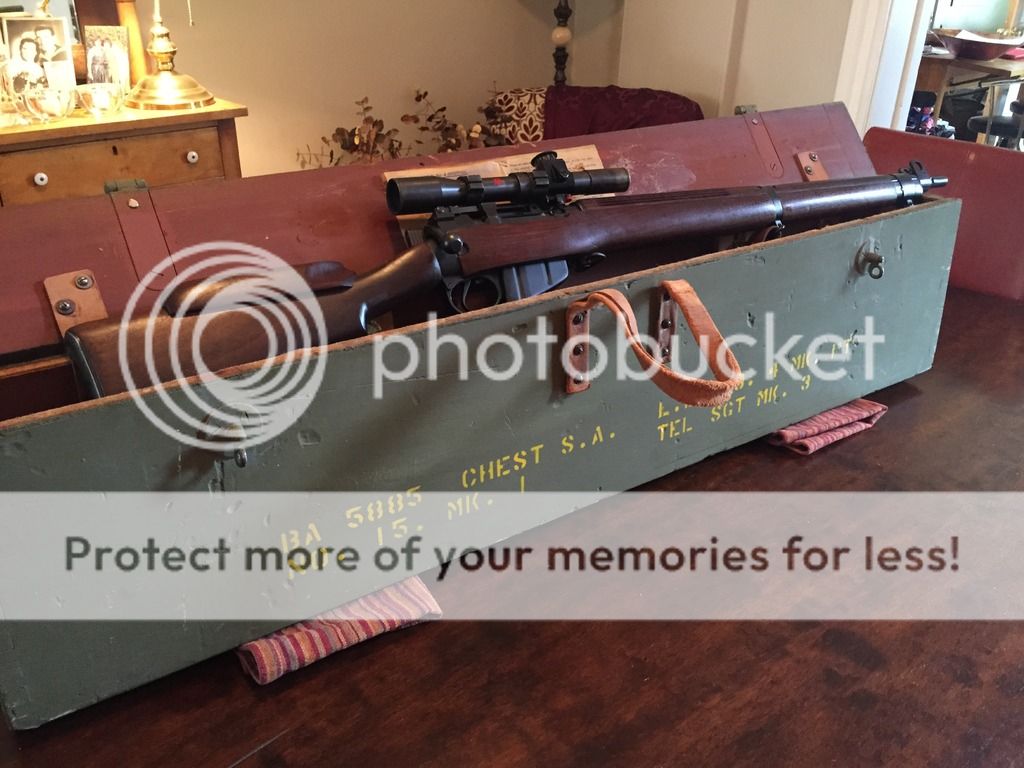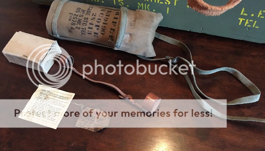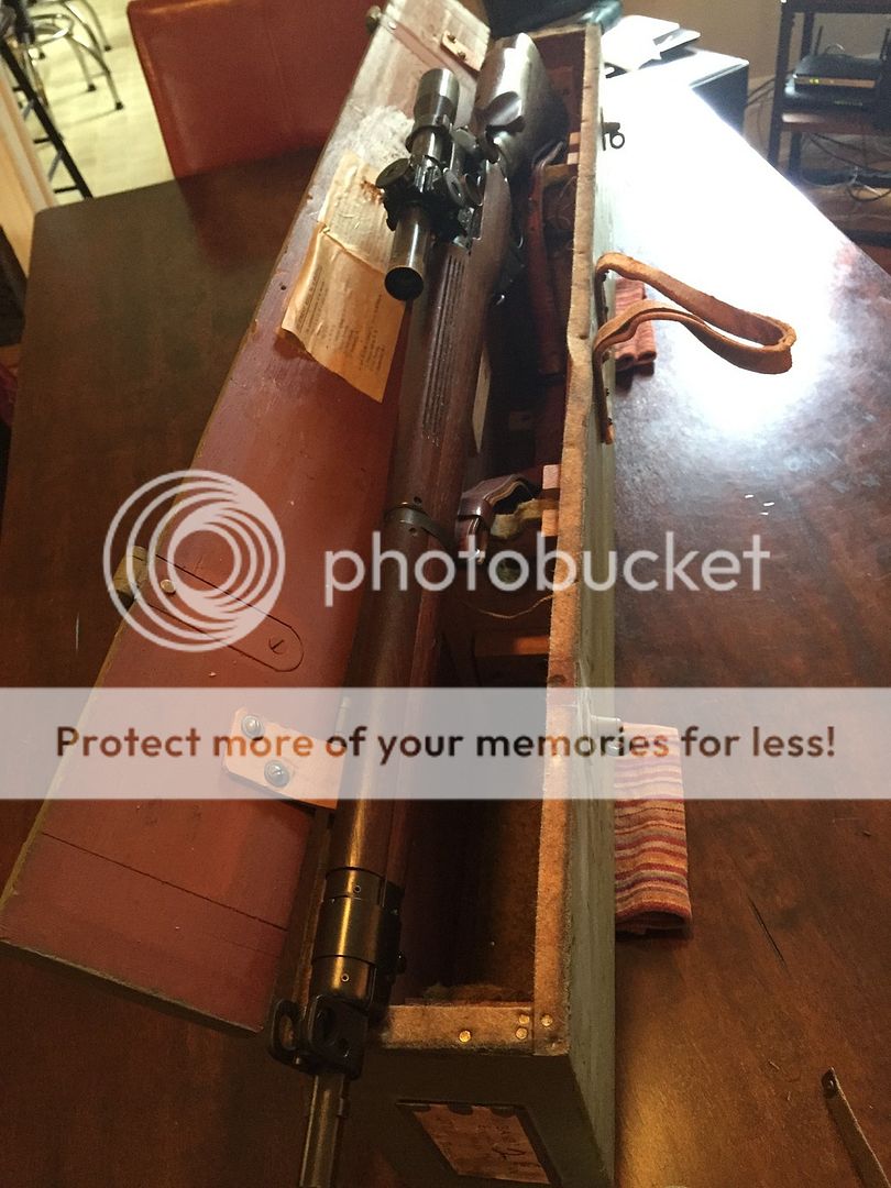 Came with extra goodies. Sniper Box, British canvas scope can (of course not matching), original lens cap, sling, box of 1943 ammo and the Original Inspection tag!