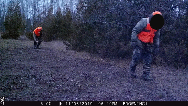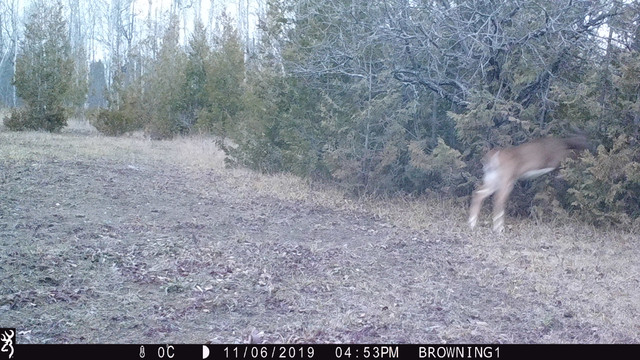 But nothing comes from the brush to my right. It is still in the field but now is along the property line and is walking towards the cut-through at the back of the food plot!