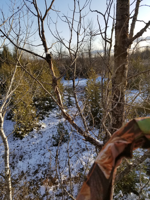 The buck has now stopped behind the stand of three cedars. My heart is pounding and i am trying to decide what to do. I might even be able to stand up to get a better angle away from this infernal shooting rail but it is cold and my boots have probably thawed the metal of the footrest and frozen a bit so that if i moved my feet it might make a terrible metallic noise.