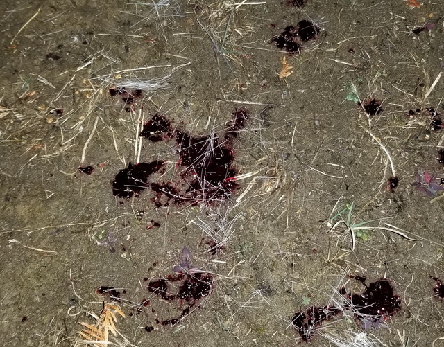 We walk out to ground zero and with flashlights we find where i hit him. Blood and fur on the ground.