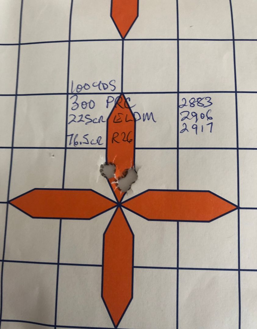 Ok heres a range report on the 300 PRC, the first time at the range it shot ok but not great, factory 225gr ELD-M were right at 1" and exactly at advertised velocity, I also shot some 230gr ScenarL with R26 and at 77grs I was at 2900 FPS, accuracy was better at 76 and 76.5 grs.