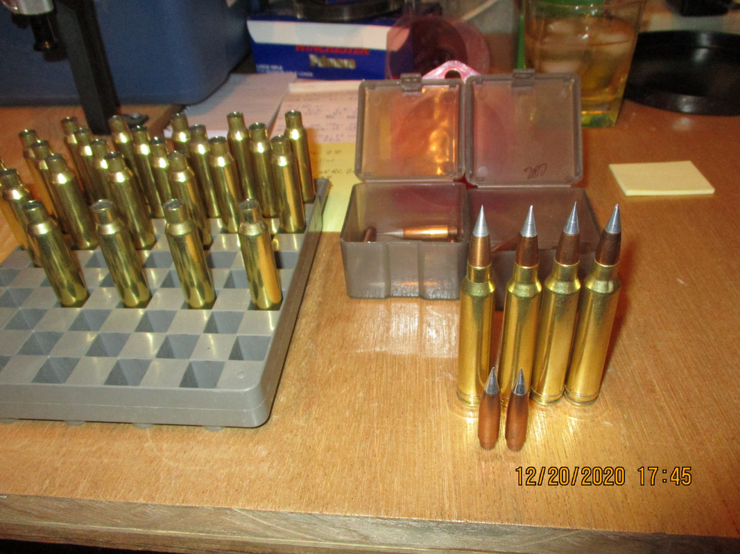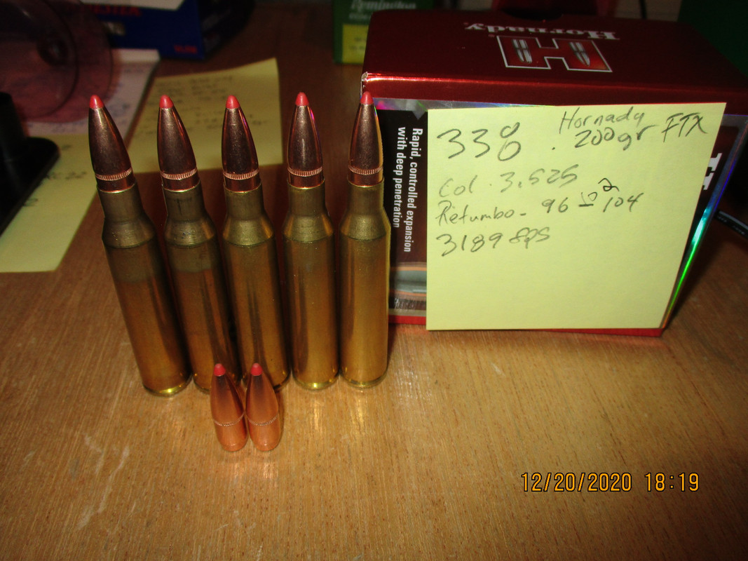 Well I was bored and had just bought some Hornady 338 cal 200gr FTX's. The plan was to send them as fast as I dared with Retumbo powder. This is the picture after reloading. That shallow was even a crunch seating.