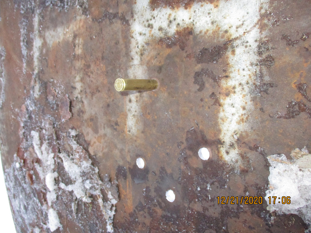 A 300 win mag case will go through the hole in 1/4 inch plate at 100 yards. Not a bad group for no aim point.