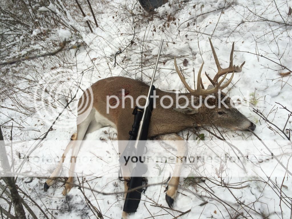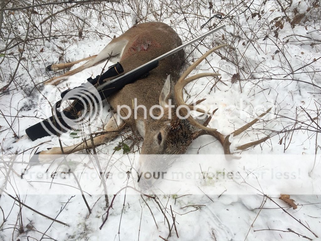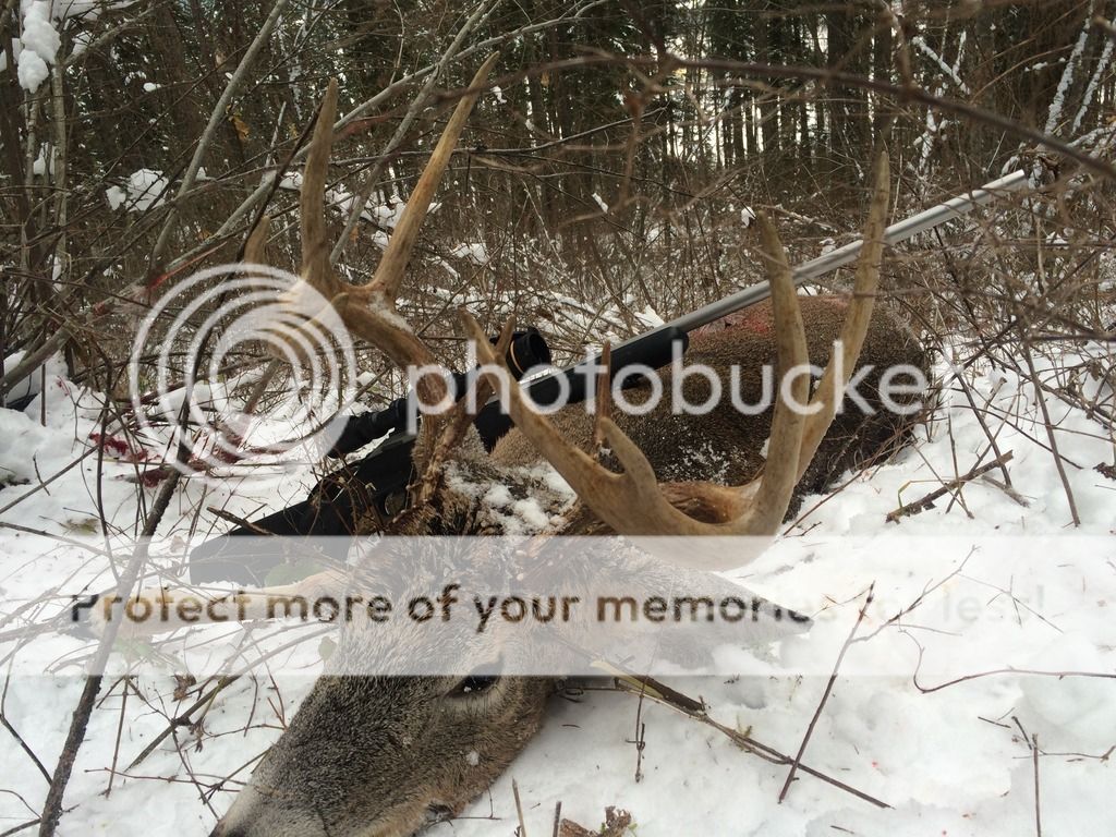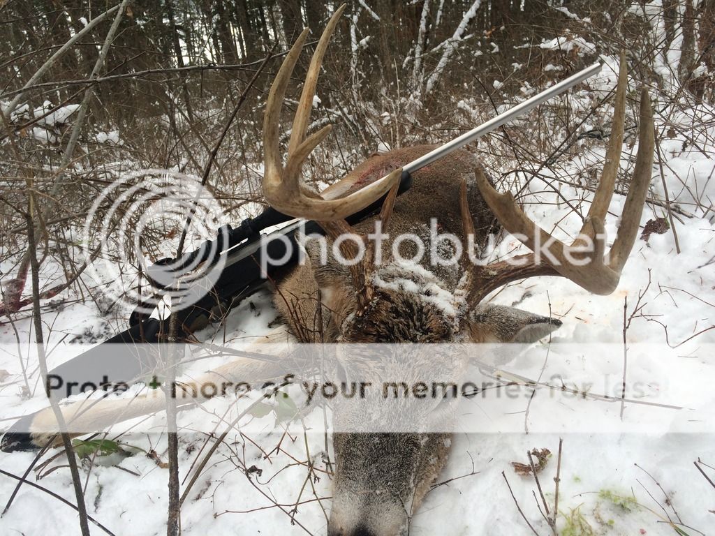 A productive morning in north Okanagan BC. Was driving down a logging road and spotted a doe in the thick brush about 50 yards in, I stopped and glassed there was this guy about 50' behind her. Just as I spotted him with the binoculars he ran, so I was now getting out of the truck and he stopped after about 40' for a sec, just as I chambered 1 he took off again. This time he only went about 20' and stopped again giving me a broad side at about 50 yards. I squeezed 1 off and he ran, so I thought I missed as It was very thick and could not get a clean line of sight. So I started glassing the brush and spotted the antlers on the ground about 20' up from where I shot at him, so I watched him for a couple minutes and he was not moving. Ended up getting him back a little bit and high of the sweet spot but it still took out enough vitals and did not waste any meat at all. The 300 WSM takes another. Good thing he was interested in other things, usually once the wt take off they do not stop, this guy behaved like a mulie. He is a bit stinky but not as bad a stinky mulie. This is the biggest 1 for me so far. He is in pretty rough shape after the skin came off, 1 hind quarter is all bruised and yellowey, a few puncture wounds so I guess he's been scapping.