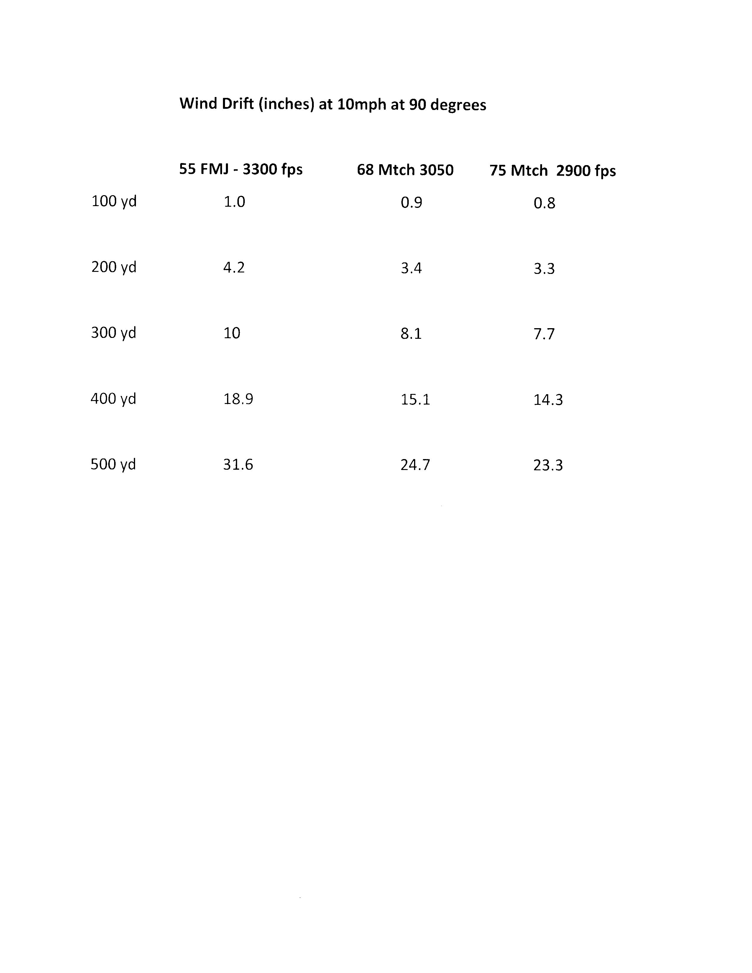 Try a 53 grain bullet with a BC of .290 or .303 if its the Nosler Varmageddon (and that BC seems accurate) at 3400 FPS. When I switched to this load, a gentleman at The High Road and elsewhere had posed 18 inches of wind drift at 10 MPH full value with the above mentioned bullet at 400 yards starting off at only 3130 fps. I didn't believe it. Now I do. This is a much different animal than the .240-.250 or so BC of the 55 gr FMJ. Since the only Hornady ammo that moves a 75 gr match bullet at 2900 fps is their Superformance load, it would be much more of a fair comparison to put it up against the 53gr Vmax Superformance load advertised at 3450 fps or so.