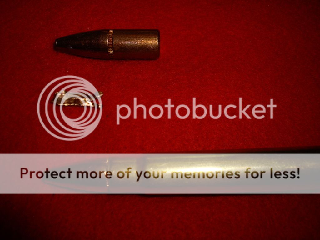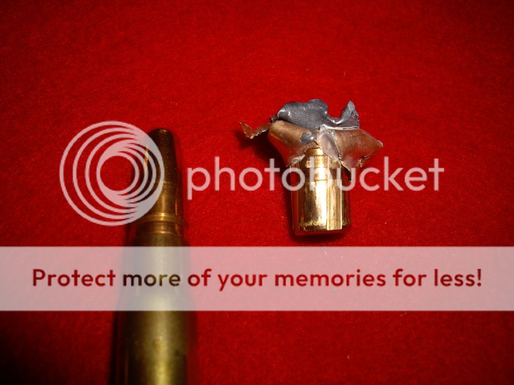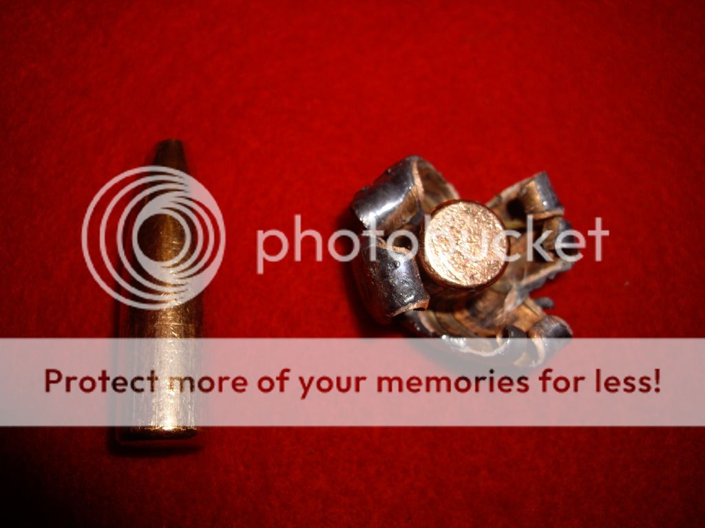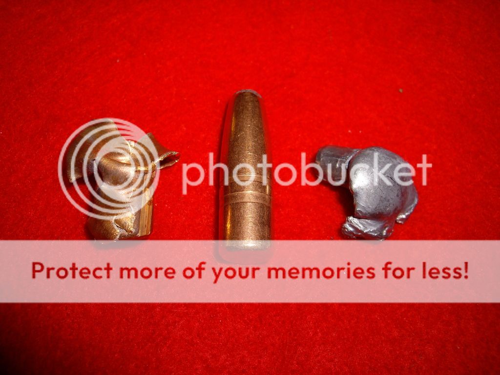 25b. 285gr Nosler partition test load 2262fps 12 paces 5th jug found a little of front part rest exited really dissapointed total weight 190 grains 150 +40