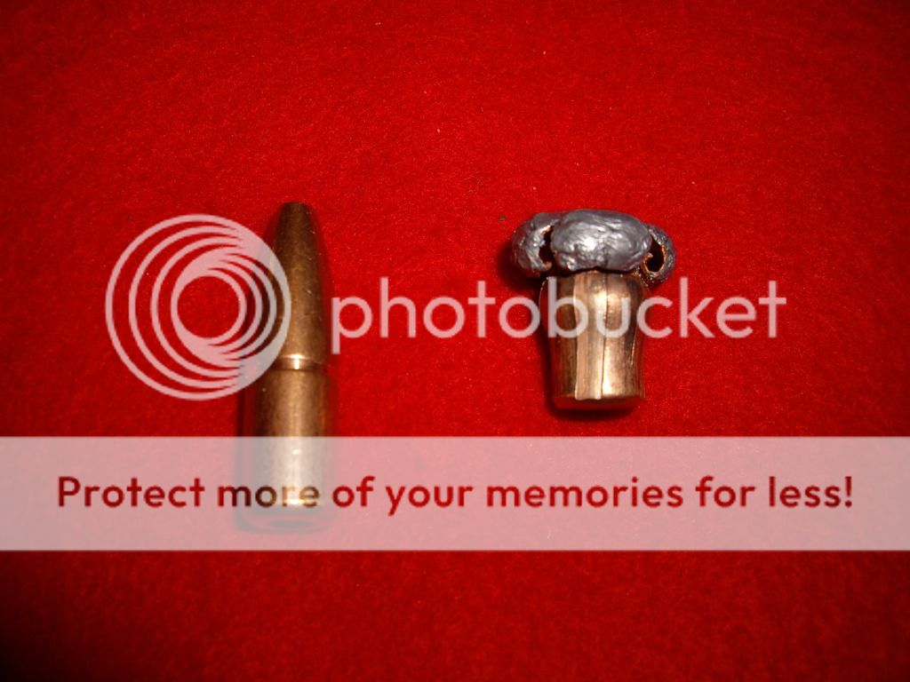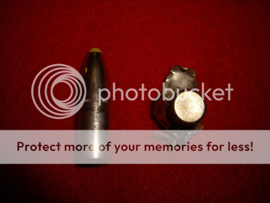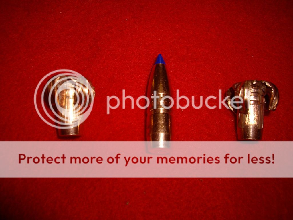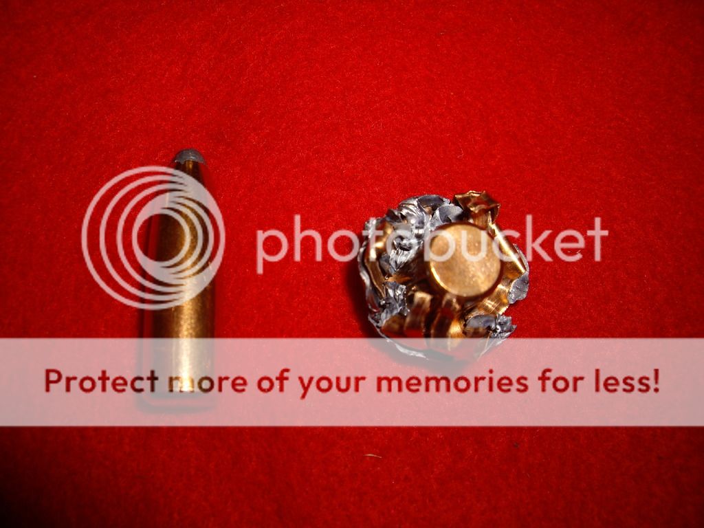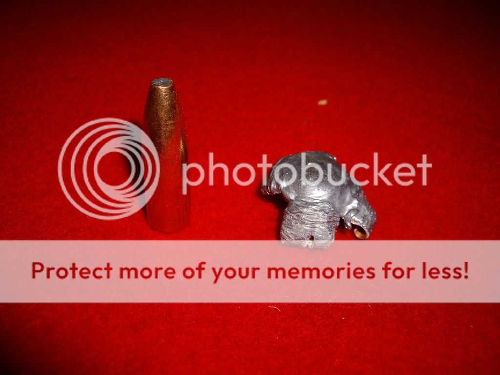 25b. 285gr Nosler partition test load 2262fps 12 paces 5th jug found a little of front part rest exited really dissapointed total weight 190 grains 150 +40