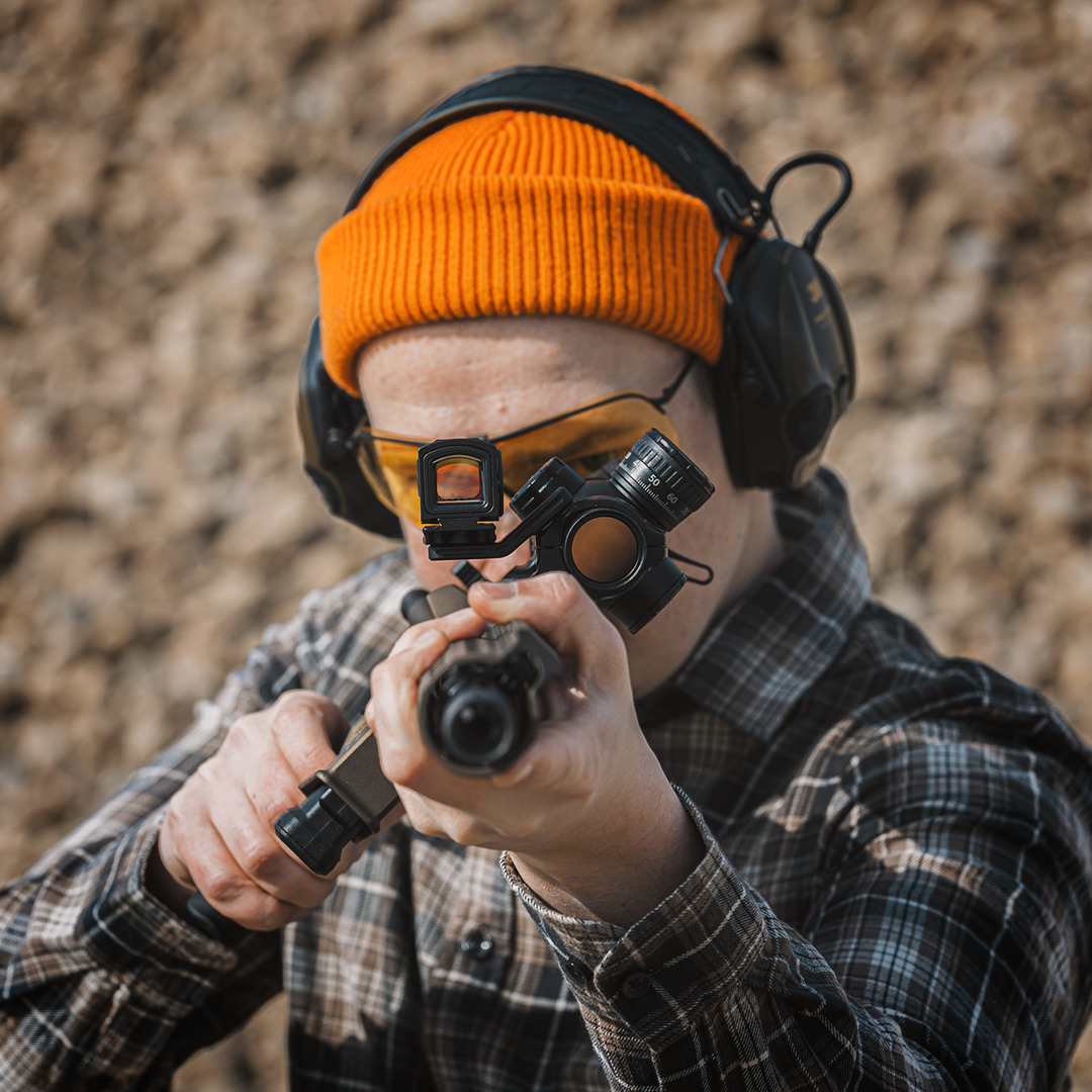 ACRO C-2 working as a secondary offset sight on a Blazer R8 straight pull rifle. Works great for fast close-up shots when you don't have time to work the zoom lever on the scope.