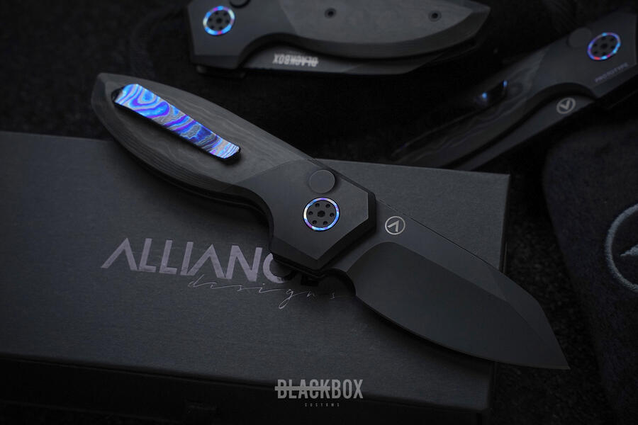 In an exclusive release in partnership with Alliance Designs; Black Box Customs is releasing a limited run folder based off of the popular Mini Slim Pickins design; this folder features Dark Ti pivot collars and pocket clip with a caged ceramic bearing system. FatCarbon Dark Matter scales protect the PVD coated Elmax steel blade when closed, and a PVD coated Titanium button-lock to secure the blade in the open position. There are only 30 of these exclusives available with each one laser engraved with the number in the batch. Once they are sold out, that's it. Jump in on this exclusive while limited supplies are available!