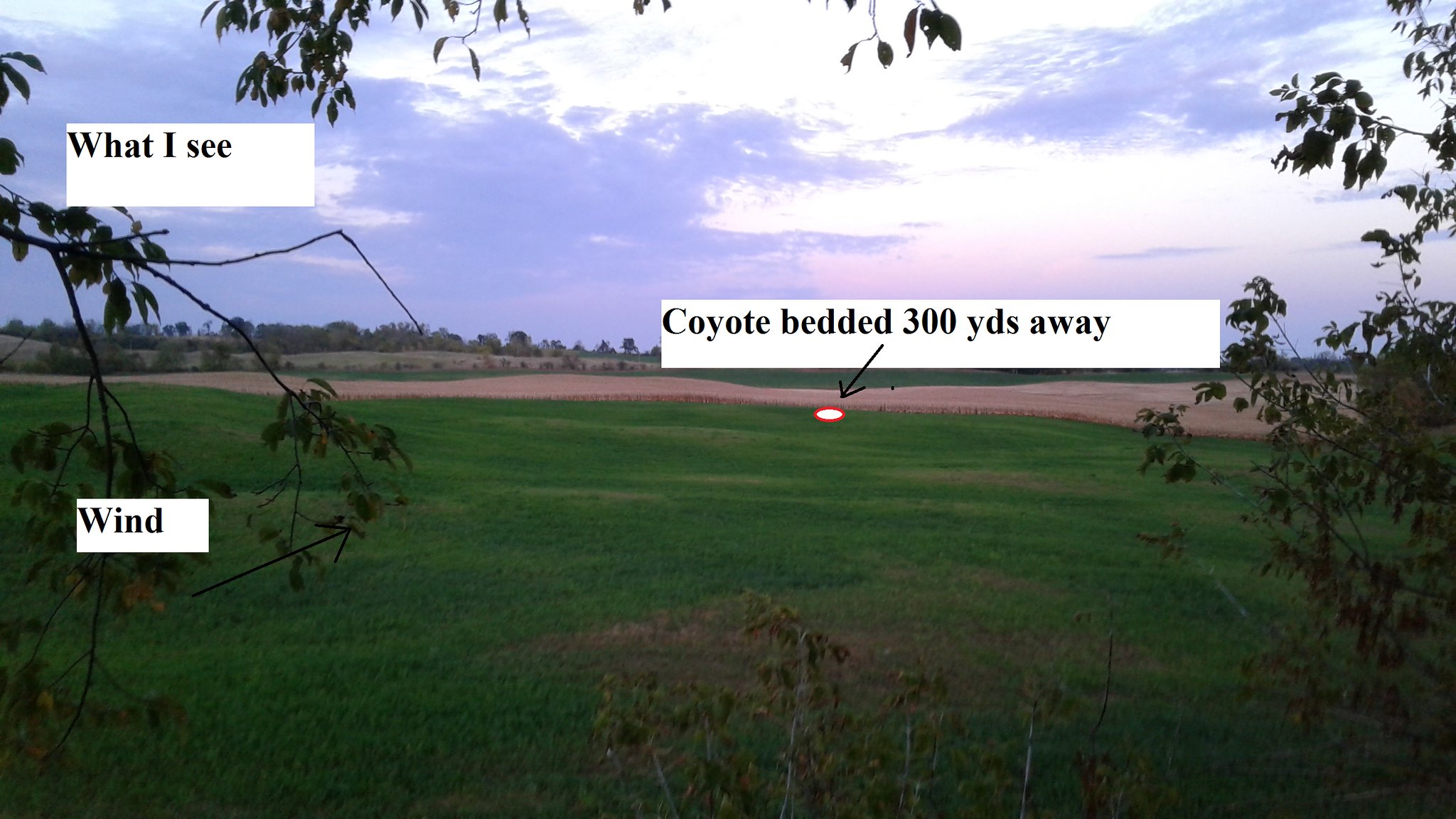 I got to the farm (ready for a deer hunt) about 6:30pm and started walking toward a back field when I spotted a coyote in the hay field mousing (about 120 yds out) ... I took cover and tried some lip squeaks to get him closer but he would not have any of it, he kept mousing. After a few minutes he walked away about 75 yds further, looked like he caught a mouse and bedded down... I thought I'd make my way around the bush, climb my tree stand and see if I can call him from there (try calling from a different location). I get to my stand, climb up but don't see him. Decide to wait it out for my original game, a deer..... but after 10 minutes I see this coyote again, I try and get him to come closer but no luck, he turns and goes the other way and beds down again. After a few minutes of watching him bedding down by the corn about 300yds way...I can't stand it anymore so I decide to forgo the deer hunt and try and sneak up on him....