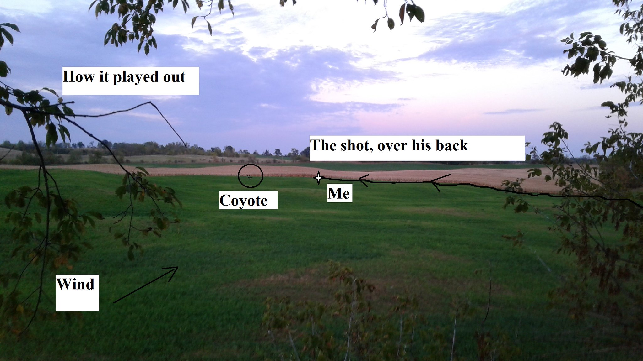 I took the long way around but finally managed to start (reached)along the row of corn toward him. The wind wasn't as strong/loud as I hoped so I had to get out of the corn (I was making too much noise) and just still hunt slowly along the edge (where hay field meets the corn). Not sure if he was still there or not but figured with the noise I am making I wouldn't be able to get closer than 40 yds... Sure enough as I near where I think he is, he stands... I get my bow up, take the safety off, but I am too shaky... I drop down on one knee but can only see the top of his head through the hay. I stand up again, put the 40 yd marker on him and take the shot. I hear nothing and see the coyote trot away... He stops about 80yds out and he just looks at me for a minute before disappearing into the corn...