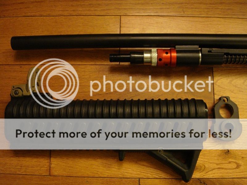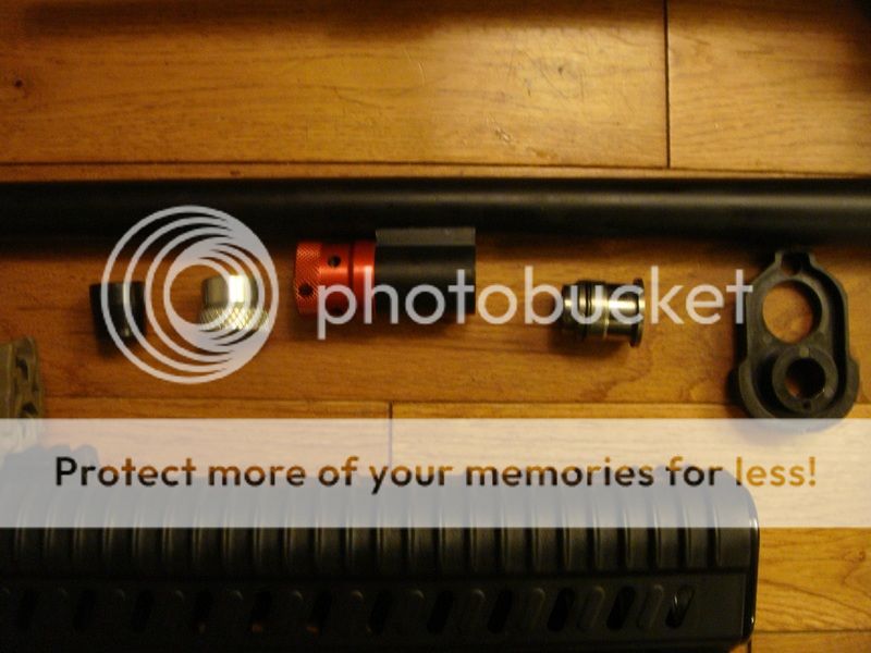 The new screw on ported gas system and plastic handguard ferrule. The silver part needs to be unscrewed before removing the barrel now .