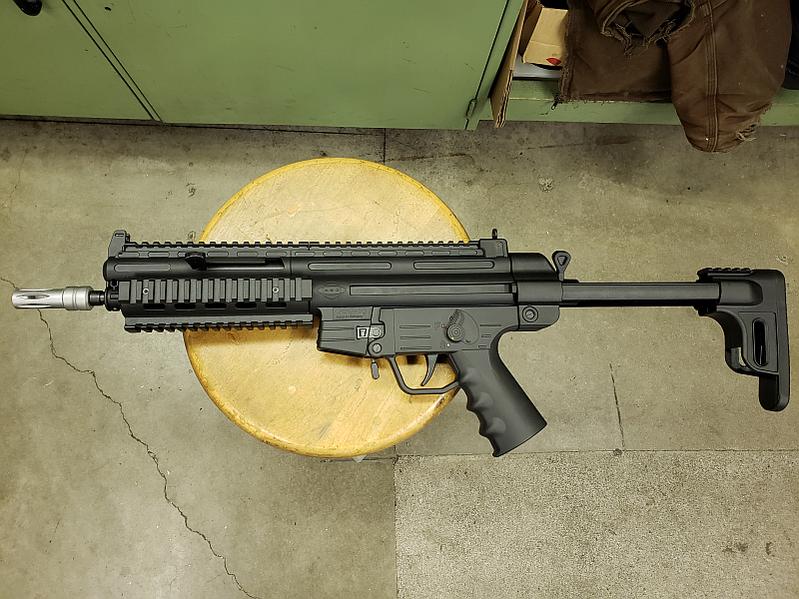 So the barrels we made here by hand, the prototypes, had an integral 1/2-28 threaded muzzle. This is great in theory because now you have a 'uge selection of readily available muzzle devices to use. But. When installing the barrel you need to insert the chamber end into the plastic ring in the body and screw the trunnion on while the barrel is captured inside that ring. Not super tough but not ideal for the layman. Our idea for the final production barrels will be to thread the muzzles M9 x .75 (same as any GSG pistol) so that you can install the trunnion easier and not have to worry about doing it in-situ. The M9 x .75 threads are the same as any other GSG pistol so the thread adapters are very easy to come by to make the final thread on the muzzle 1/2-28 tpi. If we added a 3-prong adapter then you now have 3 parts screwed together. Add a brake onto the 3-prong and whamo ! you 4 separate parts are making up the barrel assembly.