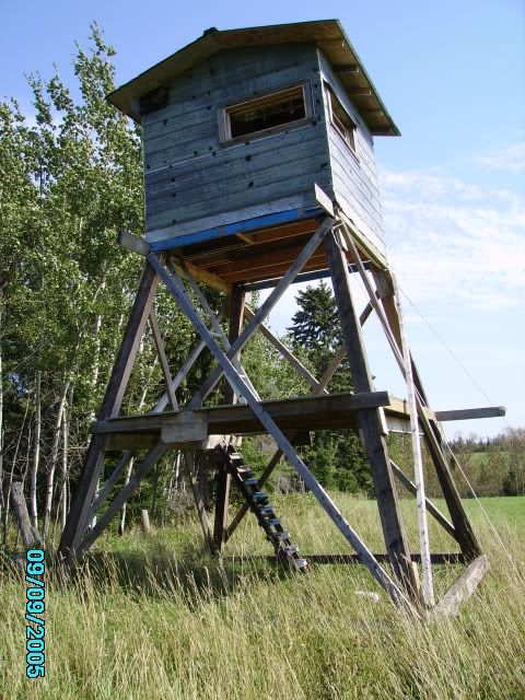 It's an 8 x 8 shack on a 16 foot high stand overlooking rolling hay(mostly alfalfa) fields to the east , south and west .