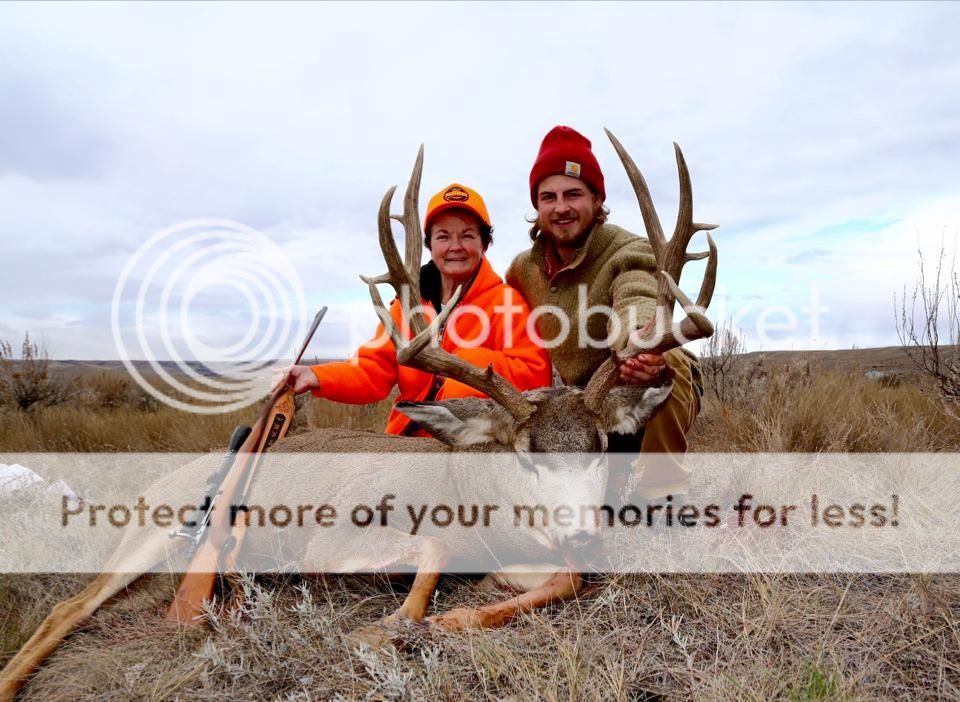 --- running shot-- Miss . One more day out, saw lots of bucks 150-- 160 ?? class typical, no shoot! Well Thursday about 10:00 in the morning we get a call from a good friend that says the guys from https://www.facebook.com/wheatkingadventures/?pnref=story are down and have a big old Mulie spotted and would like to put my wife Diane on him with a complete video and picture hunt. Wow what a thrill. She did the job with one shot at about a 100 yards with her old 1951 Husqvarna Hi Power. So the picture says it all, Check out the link that I posted above. Hunt of a lifetime. Hope you enjoy.Here is I think her first Mulie buck about 45 years ago!