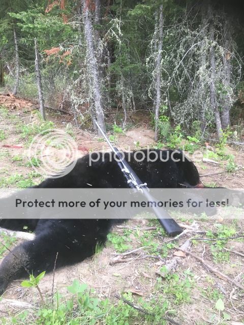 My oldest son and myself spent the weekend up at our lake lot in the northern foothills on a father-son exploring adventure. We kept it light and fun and spent hours checking creeks, looking for frogs, catching butterfly’s and having some elk smokies over the fire during the day. We put on a lot of miles on the lease roads cruising looking for feeding bears. On our last evening we spotted a bear down a small gas line, after a quick look through the binos I was convinced it was a smaller bear but we really could only see it’s back. My son wanted me to go shoot it in the worst way but I told him we don’t shoot small bears. After much back and forth he won when we came to an agreement that we would at least go see how close we could get. I brought my custom Remington 700 358STA just in case. As we got closer I was still thinking it was a smaller bear and not what we where looking for, but he still was very positive that we should take this bear. After some more thought I came to the conclusion that it wasn’t about the size of the bear and more about the expierence with my son by my side. So we closed the gap to about 40 yards and when the boar went broadise I fired hitting him good behind the shoulder. Bear dropped but got back up and took off for the bush on the side of the cutline. I fIred again, hitting him tight behind the shoulder. Again he dropped but was still moving so I fired one last round again behind the shoulder. He was now down and out. So still thinking this was a smaller bear I was quite shocked when we walked up to him and realized his size and how good of bear he actually is.