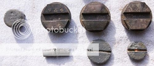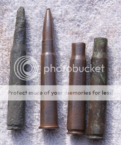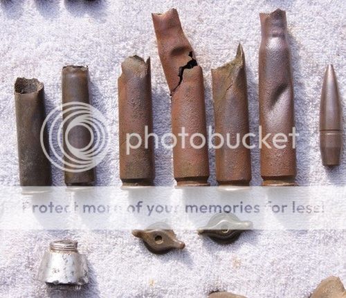 Bottom left the tip of a nose fuze, probably from a 40mm along with two wingnuts off 50cal ammo crates. 50cal bullet on right and then 50cal cartridges. But WAIT! The two far left are very slightly different to the rest....slightly narrower and the shoulder begins too low down for it to be a standard 50cal......