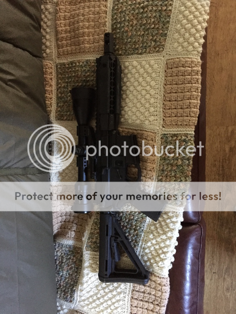 Johnny, can you dig your bills out? I would like a price on that build - minus the cost of the optic and vertical fore grip. That's a 7.5" barrel, right? I just bought a very similar Black Rain shorty from the boys at the Phoenix gun shop last Friday. $1995.00. Mine probably isn't as snazzy as yours, so I think you have a few farkles on there that I do not. How much for that can and buttstock? They are fairly pricey, right? You could probably knock a few beans off your total if you went to more plain offerings I would think...