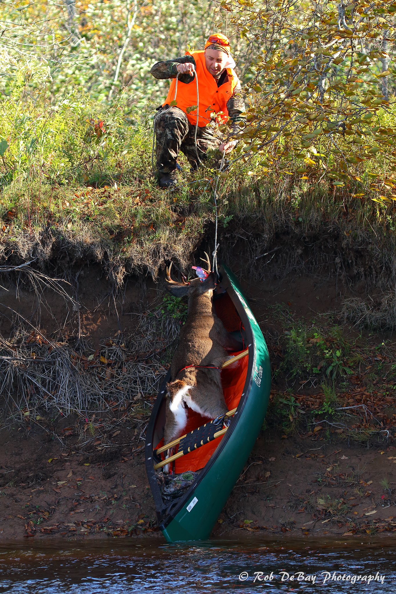 I didn’t sleep very well worrying about my deer. That parachord is no match for raccoon teeth. Maybe I should have come for the canoe right away and brought him out in the dark. Next morning I loaded up my smallest canoe (to make the buck look big!) and hit the road. I met up with Take’em and pointed out where I’d be coming to the riverbank and then went to my canoe launch and paddled down. Greatly relieved to find my deer safe and sound, I set to work bringing him out to where the paparazzi awaited!