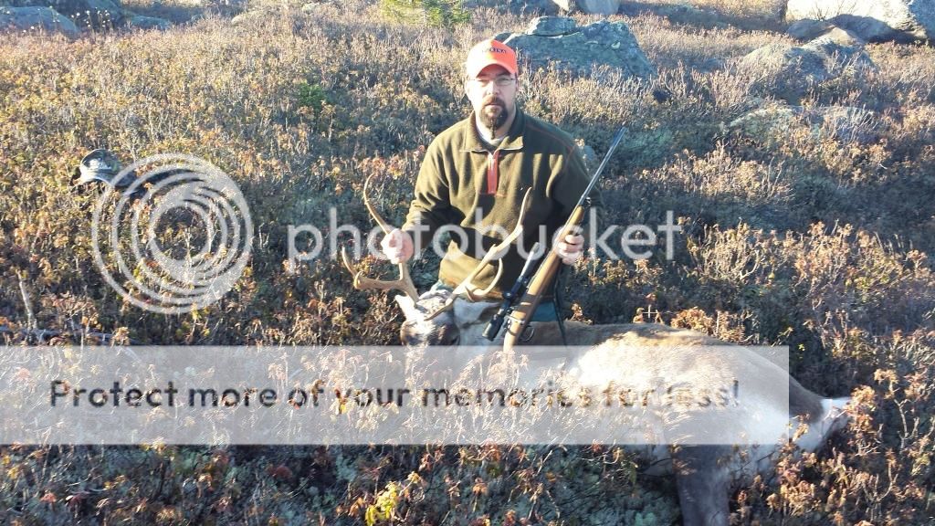 We came across a nice view overlooking a small river and it seems to be a popular spot to go fishing from the fire pit and area cleared to put up a tent. I stopped the truck to take a little look and didn't expect to see much. When I looked across to the other side I spotted a white object, female caribou, and got a little excited then thinking maybe I might see a stag with her but two more females appeared. Finally a stag stepped into view and I brought out my rifle. I steadied myself on the hood and got him in the crosshairs and held a little high on the vitals because of the distance. When I fired he reared up a bit on his hind legs and held himself in the air for a second or two before going down.