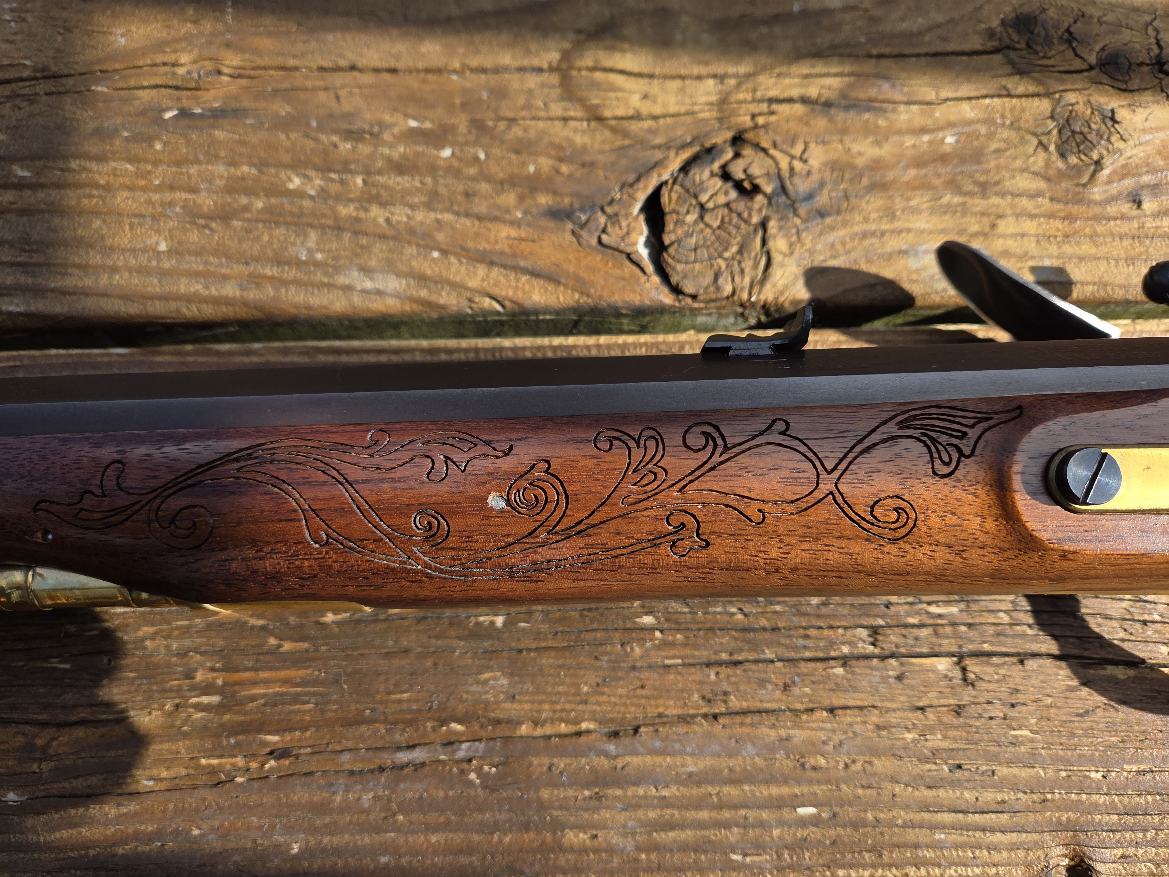 Could someone would be able to identify the artist who did this nice and perfect carving work? I bought the gun few tears back as new old stock. I did write to Pedersoli and they told me that this custom made 54 cal. Jäger rifle produced in the Target version with slow 1:65 twist and the shorter 28" barrel's length of the Hunter model was manufactured and shipped to Canada in 2004. They also told me that the carved stock and patch box, probably was a work made by the previous owner. Thanks!