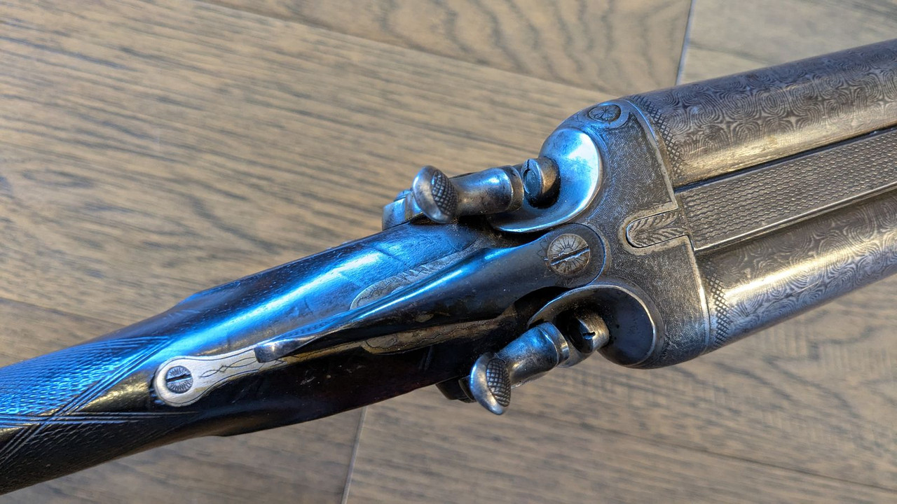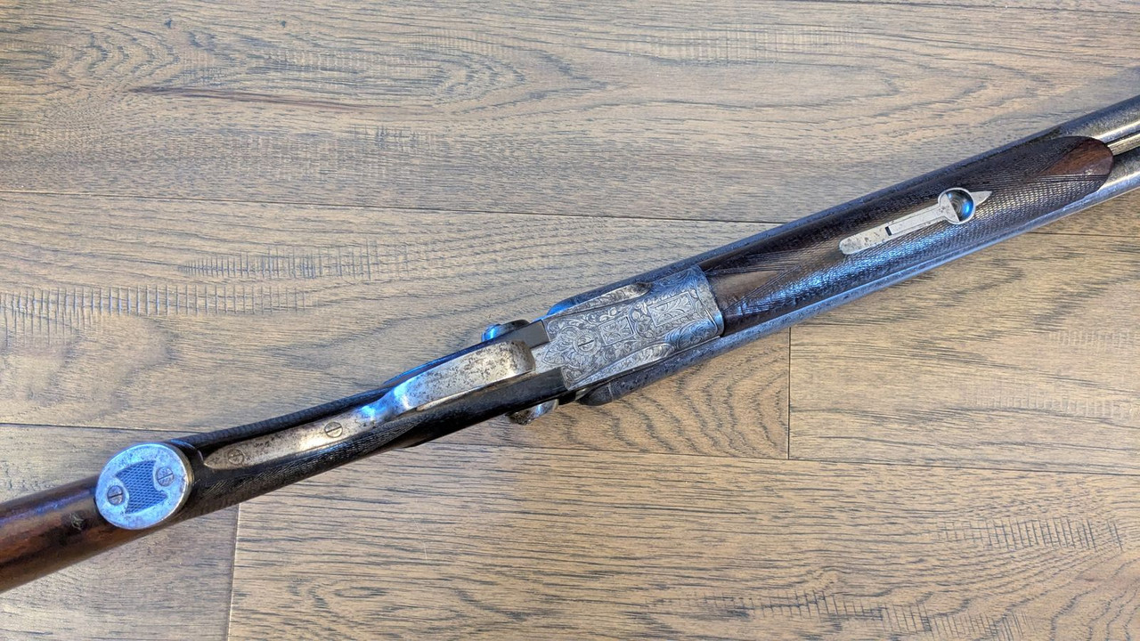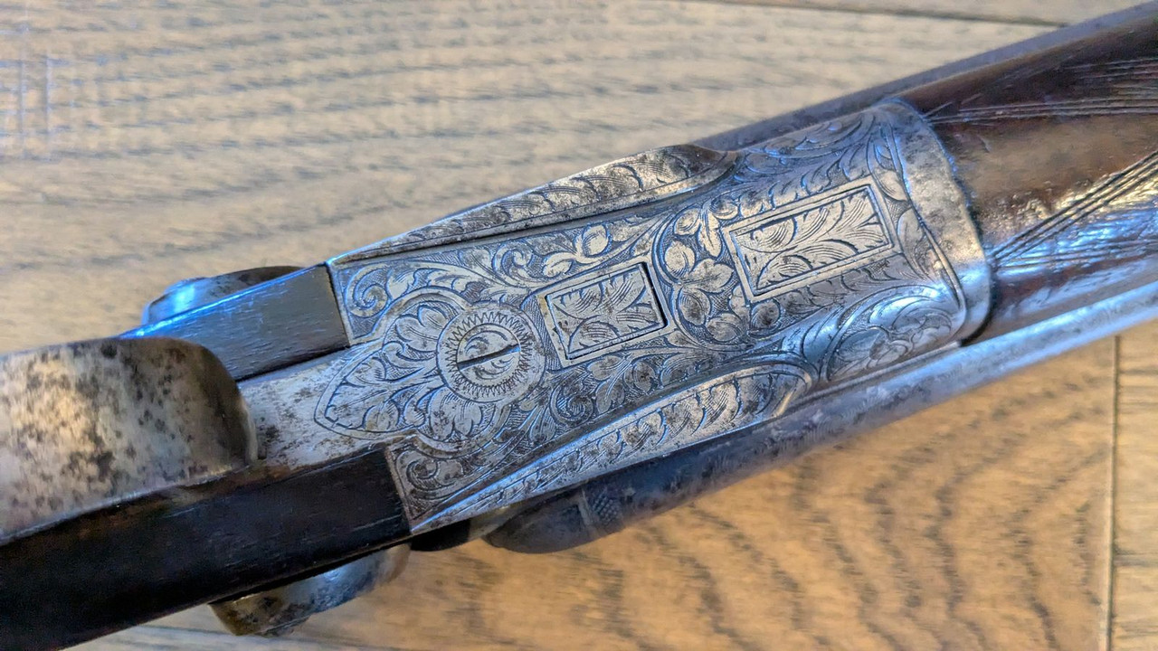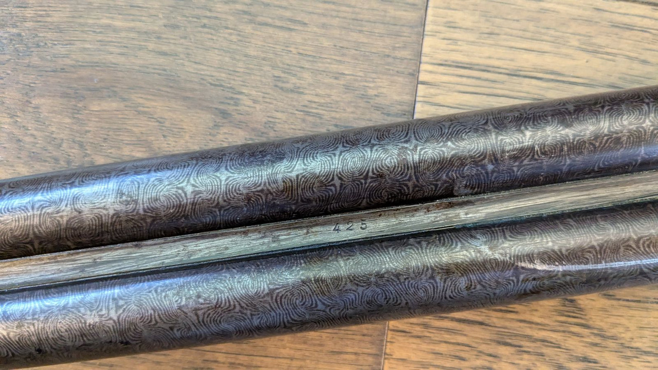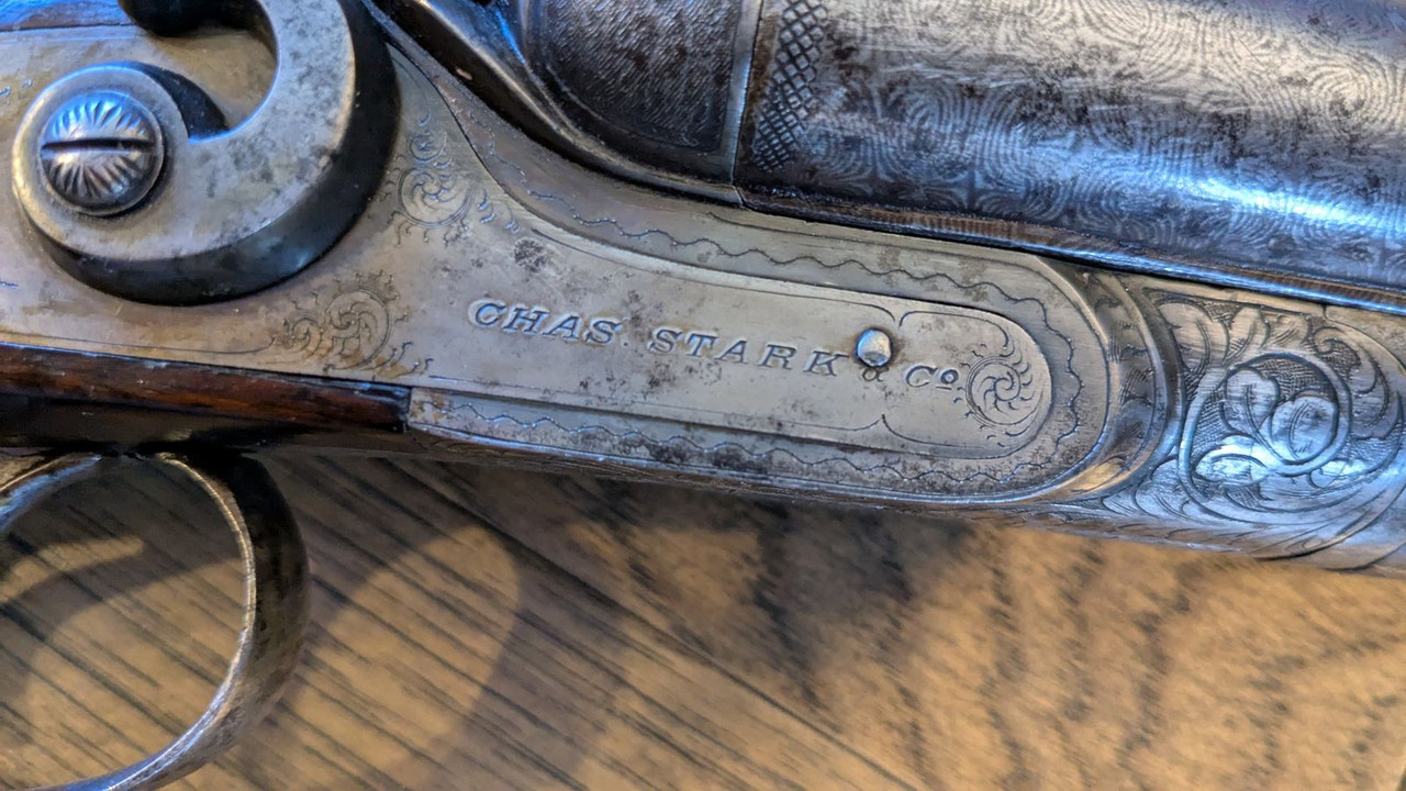 Shotgun itself turned out to be Belgian made 12ga, Damascus barrels. Matching numbers on flats and barrel, no serial on forend. Shotgun markings don't allow me to date it. However Chass Stark started having financial troubles in 1892, died in 1899 and business closed in 1905, so I assume it is post 1887 (absent in 1887 catalogue) and pre-1892.