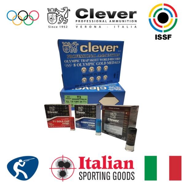 Clever T3 Grand Italia - The professional line used by world cup and Olympic shooters. This line has the most versatility in its loads from 24gr Olympic loads, to 1oz, and heavy hitting 1 1/8oz. With extra hard lead, the T3 line holds its shape which give better patters.