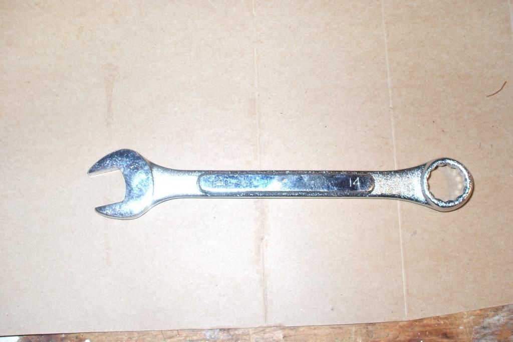 I found a cheap 14mm wrench (didn't want to use something good) and some standard light brown shoe polish (didn't have clear or neutral).