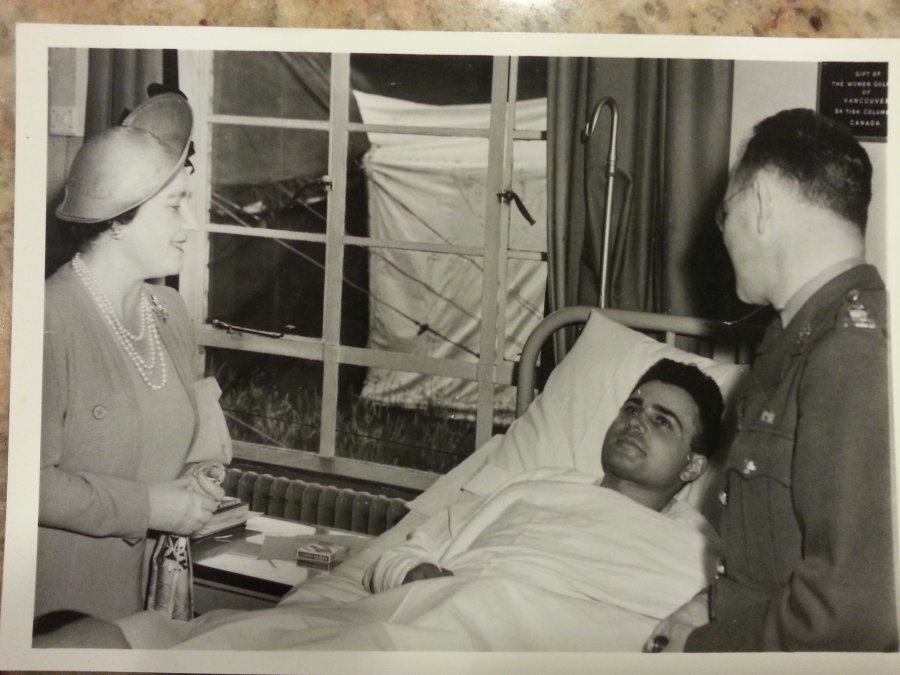 Corporal Walter Williams bren gunner, my grandfather, recovering in England after being wounded D-Day+4. First wave of Canadians to land. Many of the men he trained with didn't make it out of the landing craft. The lady on the left is the Queen Mother. Very proud of him and all my grandparents. They were a different breed of people. Hardy, hard working and happy. I miss them.