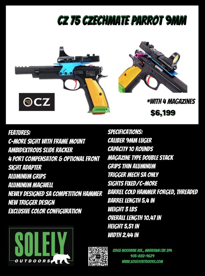 SolelyOutdoors CGN Regular Business Member Rating - 100% 9 0 0 Location 44 Riviera Dr L3R 5M1 Markham, ON Jun 26, 2019 #1 https://www.solelyoutdoors.com/cz-75-czechmate-parrot-9mm.html Attachments mmexport1561586608509.jpg 88.9 KB · Views: 428