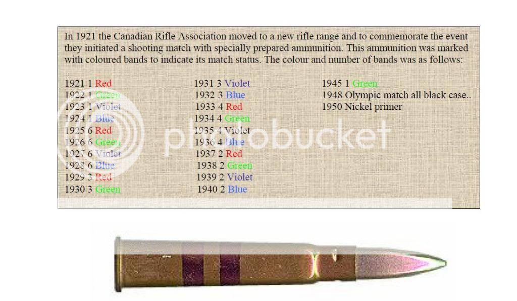 Sorry for my late addition to this conversation. Here is a photo of a reasonable selection of the Canadian .303 British Match cartridges that are being discussed: