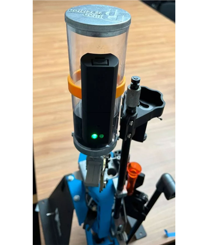 The Sensor is a compact size and contoured to fit snugly onto the side of your powder hopper, without interfering with other dies or accessories on your press. You can position it so it’s facing you – making the alarm LED as visible as possible.