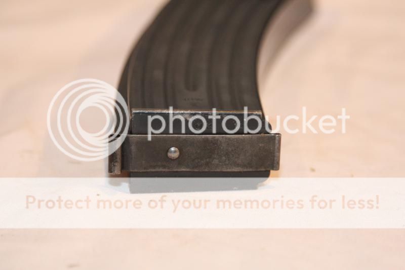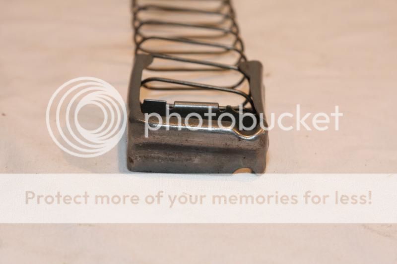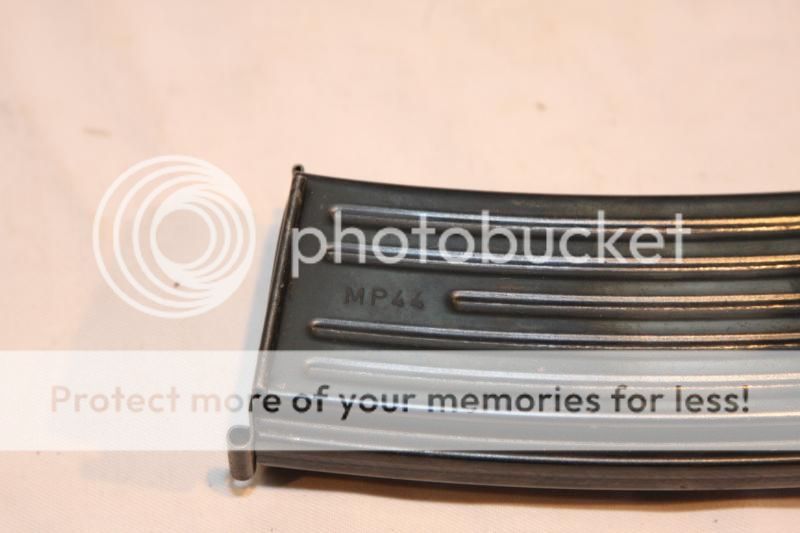 The MP40 magazines were made of formed sheet metal, as was the follower, and had a normal maximum 32 round capacity of 9mm Parabellum ammunition. The magazine was a double-stack, single-feed design. Shown below is one of the later more common examples of this magazine, marked MP38u.40.