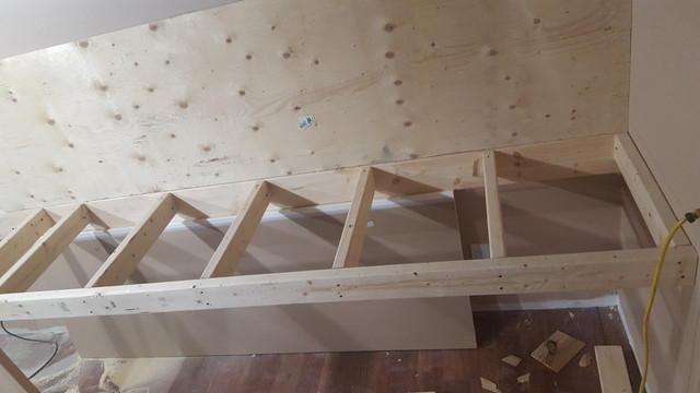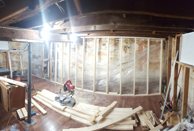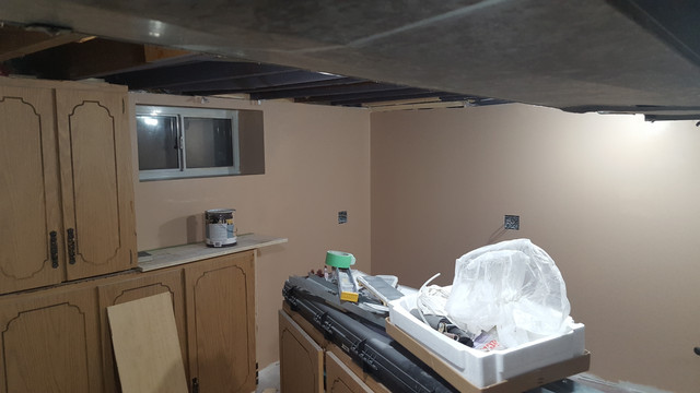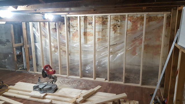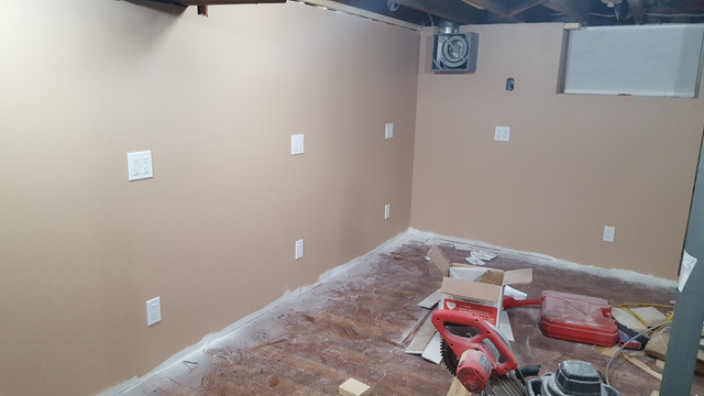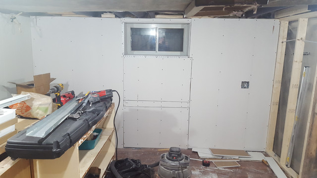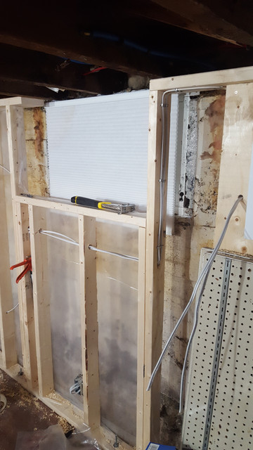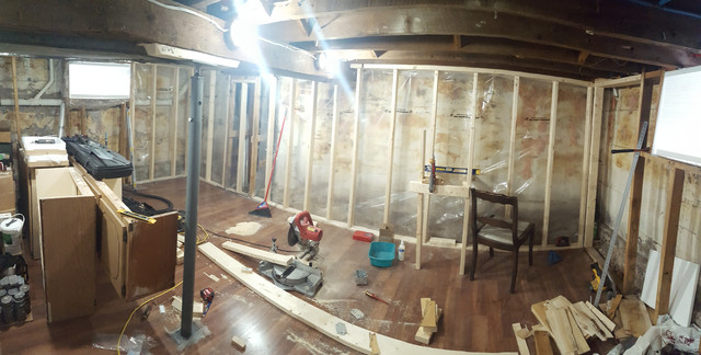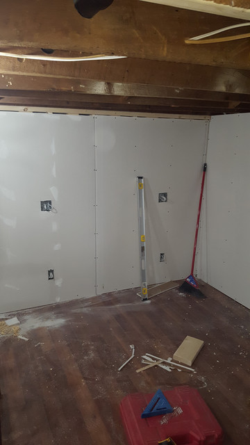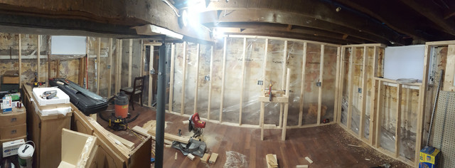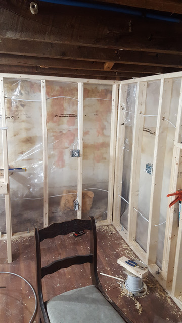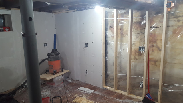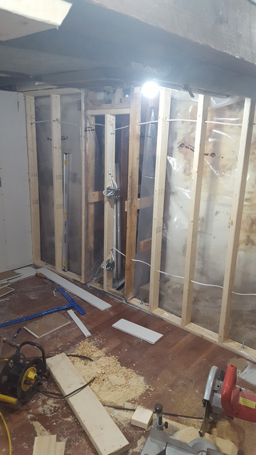 I bought my first house back in May and after alot of repairs (1930's house, idiot people attempted reno's) I have finally started building my reloading/gun/work room in the basement. The basement is boarder line tall enough (6 foot tall in most places) so i couldn't put in a ceiling. I tore down the existing wall and wood panelling to discovery several issues (Mice, bad plumbing and electrical) that have since been fixed. I didn't insulate the new wall because mice will likely get back in (until i can properly seal the house up) but i did put in vapour barrier.