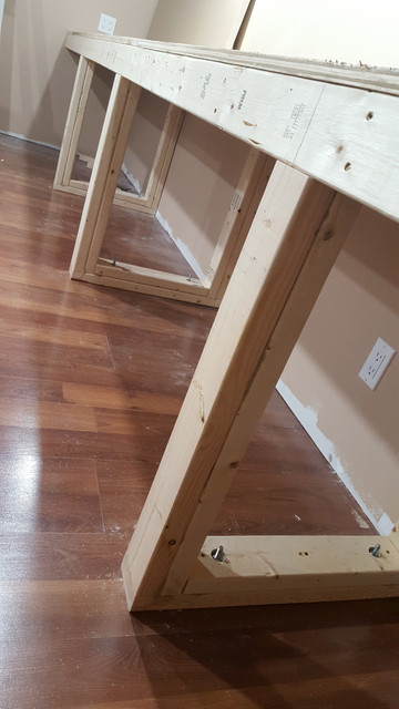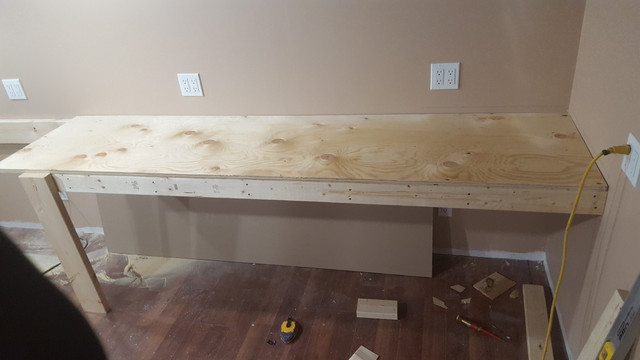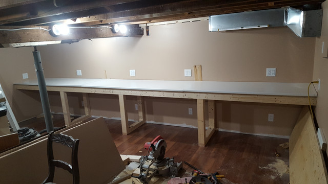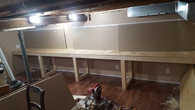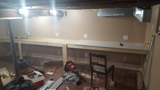 I put a 2x6 along the wall screwed into the studs and built the rest with 2x4's. The top of the bench is a single layer of 3/4" plywood with ikea 1 1/8" thick counter top screwed and glued to the plywood. The 3 support legs are 2x4's glued and screwed together with two 3/8" lags into the foundation. Not as over built as I originally planned but plenty strong enough for my purposes. Ammo, component and tool storage is to the left with more to come later on. The left side of the bench will be all my presses, the middle i plan to wall mount a monitor for reloading info/entertainment and on the right side will be my casting / powder coating station.