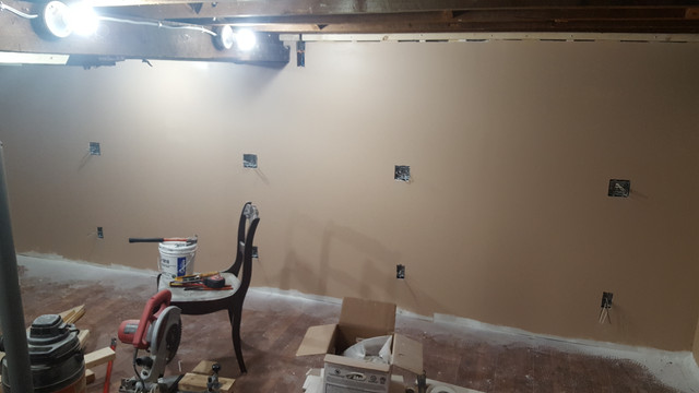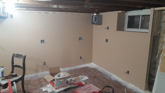 I was able to get a 240 cfm exhaust fan for free from work for the casting section. I attached a 8x8" duct to the fan and plan to have two or three 4" round flexible ducts coming off it to go to the various spots that need exhausting. I will be putting in a filter rack in the main duct then a pre filter for the powder coating station. I wanted a lot of plugs so i didn't have to put in power bars so 18 outlets went in but of course after i boarded, mudded and painted i then thought about putting air lines and central vacuum piping for the bench but it's not the end of the world.
