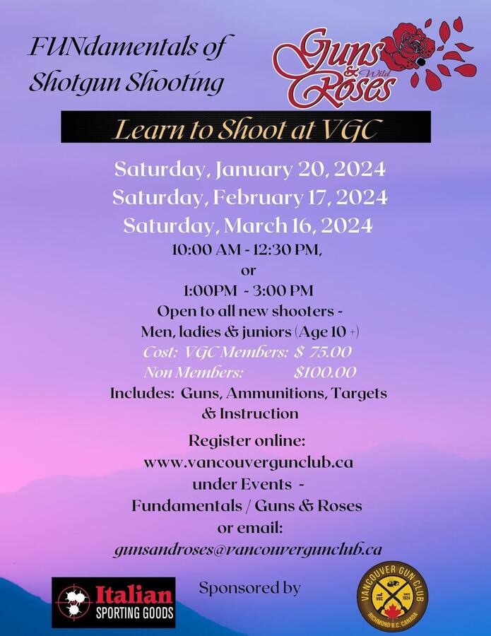 The new 2024 schedule for January, February, and March. FUNdamentals of shotgun shooting and the all Ladies shoot Guns N Roses at Vancouver Gun Club in Richmond BC. For new shooters or shooters who wish to sharpen their skills. Set yourself in the right direction with a solid foundation in the basics of shotgun shooting. Positions sell out fast. See listings below.