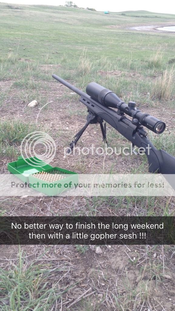 Here's one of my brother and I in a close friends pasture. I'm shootings my LH rem 700 sps varmint in 17 fireball, vortex crossfire 4-16x50 scope on top. Loaded with my 20/20 special (20gr 8208 xbr powder, 20gr norsler varmageddon FBHP bullets, 4050 fps). It's a laser beam on gophers out to 200 yards and sometimes further (if we get a rare, windless day here in SE Sask). My brother shooting his CZ 452 in 17 hmr with a vortex crossfire 2 3-9x50 BDC in the distance. Talk about a guy that "knows his gun" he was hitting 2:1 and sometimes 3:1 ratio to my self off shooting sticks, no bipod, probably close to 85% hit-to-miss ratio for him that day, (I said "my scope was off that day" that's always my excuse lol).