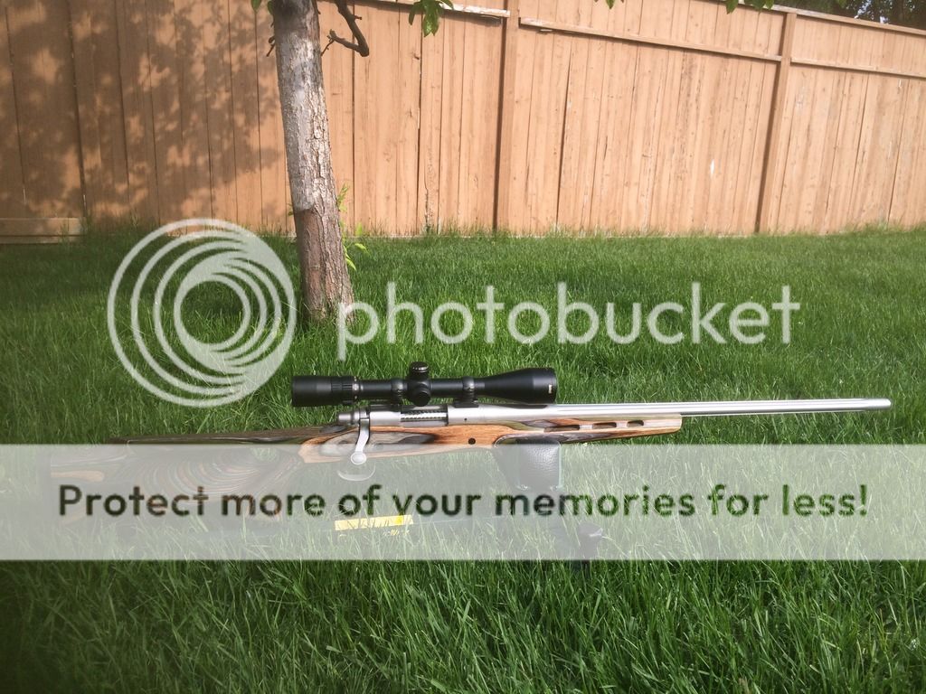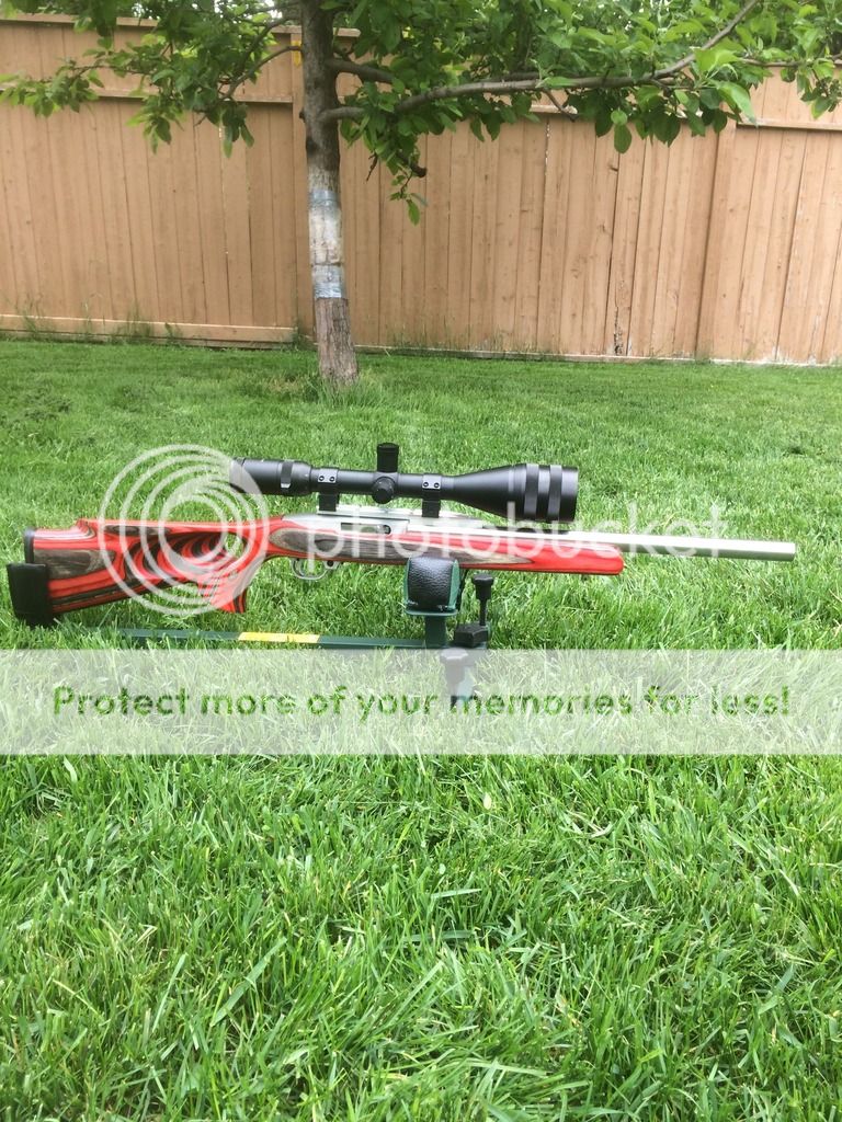 No decent field pictures, but here's my brother's beloved 10/22. On a good day, it'll shoot a jagged hole @100 yards using good ammo. Volqartsen barrel, trigger sear, KIDD buffer, Dlask over sized mag release, bolt handle and spring kit, Millet 5-25x50 (30mm tube) scope, on an all metal stainless ruger 10/22 receiver, sitting in a gorgeous revolution stock. Surprisingly clear piece of glass and devistating in the gopher field! 10 shots as fast as you can pull the trigger.