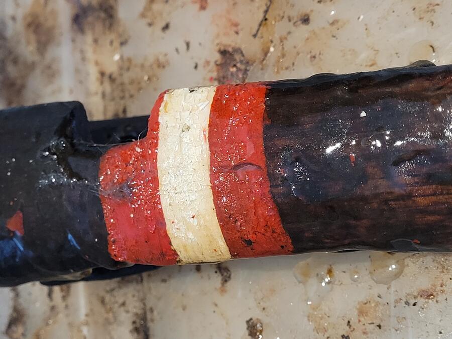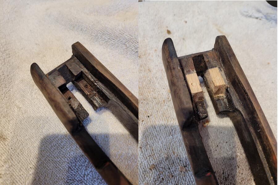 Then, wood parts are stripped of their old grime and DP paint stripes (if applicable). This allows, among other things, to better find defects – splits and cracks, stripped screw holes in the buttstock, anything requiring repair. And of particular attention: the recoil draws at the back of the forend, which will have to be in tight contact with the action’s recoil lugs when forend bedding is taken care of. Some draws come out ok as-is; most will require some shimming; others may need to be completely redone (see picture below for an extreme example that had to be rebuilt)