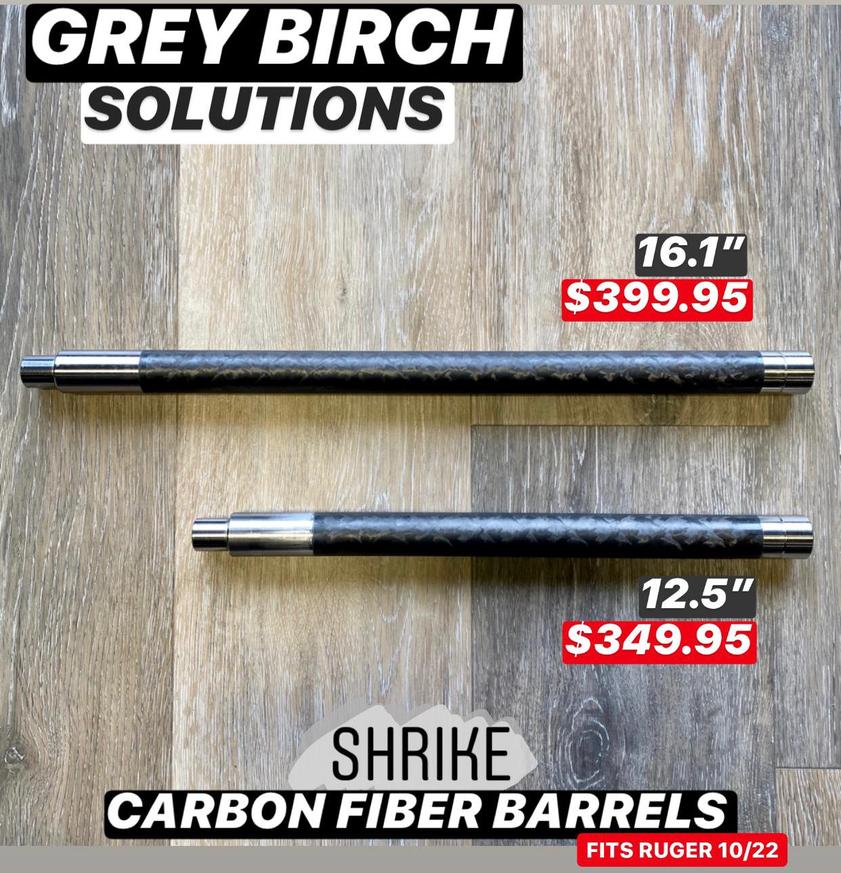 The GBS Carbon Fiber 22LR barrels (12.5” and 16.1”) exceed every measure of performance testing and push the boundaries of being the lightest barrels in the world. They boast the highest performance Carbon Fiber wrap with a match grade 416 Stainless steel barrel.