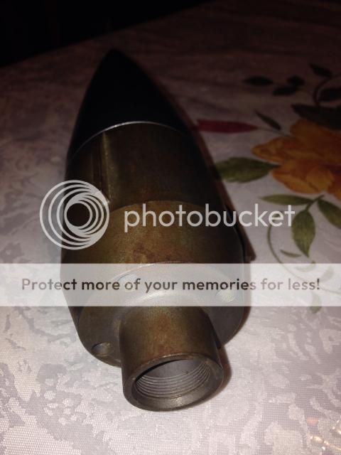 So here goes...it's 10.5" long, 2.25" in diameter. Cone is machined steel, base section has three machined fins. Has an inside threaded socket on the bottom, and 4 holes surrounding it. All holes are blind.