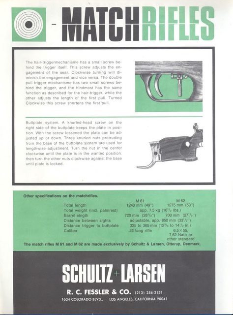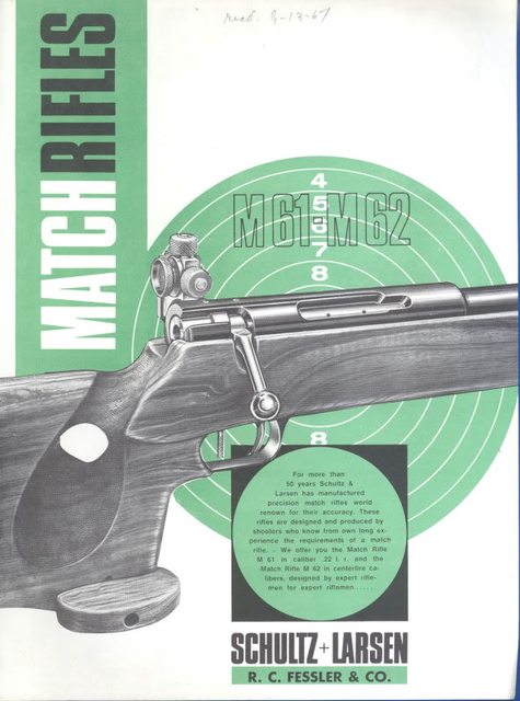 The Schultz and Larsen Model 61 had its best years in the 1950's and early 1960's. It's offset sights were a product of the rifle design and components also doing double duty as a centerfire model. The reason for the offset sights was so that the problem of mirage from a hot centerfire barrel would be less of an issue for the shooter. The rifle in .22LR was equally capable of being used at both 50 and 100 yards. If the sights could be used for shooting at one distance, they were good for the other as well.