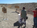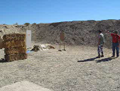 Mike C. of Boise, ID at the beginning of Stage 9, 'Don't Rush Me'. The three moving targets were activated by the shooter by pulling the handle visible in front of Mike. The targets had to be engaged in 'Tactical Sequence' (1-1-2-1-1) while retreating to cover. The targets 'disappeared' by falling forward when they reached the end of the track.