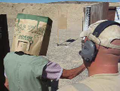 This is Tom H. of Tactical Solutions (Boise, ID) at the beginning of Stage 5, 'Lights Out Revisited'. The paper bag over his head was to simulate shooting an intruder 'in the dark'. The first target had to be engaged with 6 rounds after which you could 'turn on the lights' by taking the bag off.