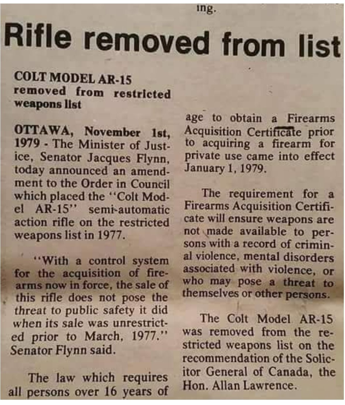 Please note that the Ar-15 was non-restricted before 1977. It was restricted by OIC in 1977. In 1979 after Trudeaus the senior implemented the FAC system the AR-15 was moved back to non-restricted via another OIC.